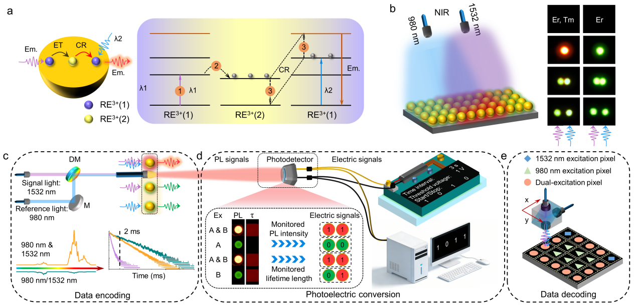 镧系掺杂上转换发光在超分辨成像、三维显示与信息安全等领域具有重要应用价值。然而,镧系离子能级结构复杂导致电子布居过程难以调控,实现上转换发光的动态操纵仍是该领域的关键挑战。为此,我校物理与材料工程学院研究团队与哈尔滨工业大学合作,创新提出一种双波长协同激发策略,通过直接操控离子间的交叉弛豫过程,实现了对上转换发光的动态与精准调控。研究采用具有独特层状结构、超长激发态寿命及低声子能量的NaYS2为基质,借助双波长激发定向调控交叉弛豫路径,在Er3+-Ln3+(Ln3+= Tm3+, Ho3+, Yb3+)体系中实现了目标激发态的选择性布居。该方法不仅将红色上转换发光增强约20倍,还实现了红-绿发光颜色的动态切换。在此基础上,进一步构建了光学逻辑门与动态随机视觉加密系统,为光学信息安全领域的实际应用提供了新的研究思路。