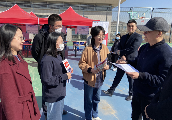 民大新闻网讯 3月29日至30日,我校与大连金普新区党工委组织部(人才办)、大连金普新区人力资源和社会保障局联合举办的2021届毕业生春季双选会,在开发区校区体育场和金石滩校区篮球场举行。学校党委副书记、副校长陈明华深入双选会现场,与用人单位和应聘学生进行交流,了解招聘需求和求职情况。