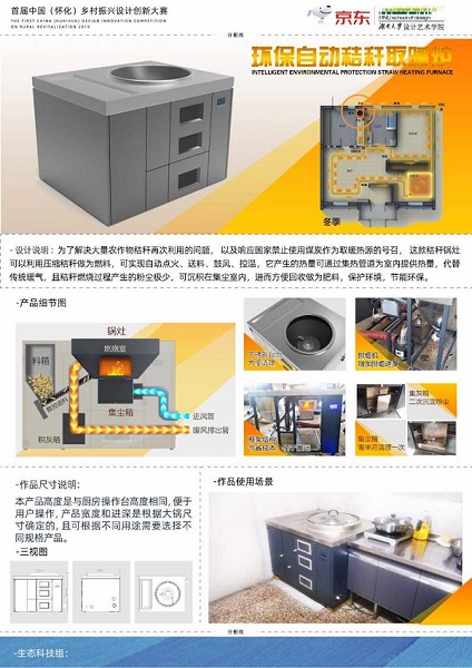 “环保自动秸秆取暖炉”是响应国家禁止使用煤炭作为取暖热源的号召,解决农作物秸秆再次利用问题的设计。这款取暖炉利用压缩秸秆为燃料,可实现自动点火、送料、鼓风、控温,产生的热量可通过集热管道为室内提供热量,代替传统暖气,且秸秆燃烧过程产生的粉尘极少,可沉积在集尘室内,方便回收作为肥料,保护环境,节能环保。