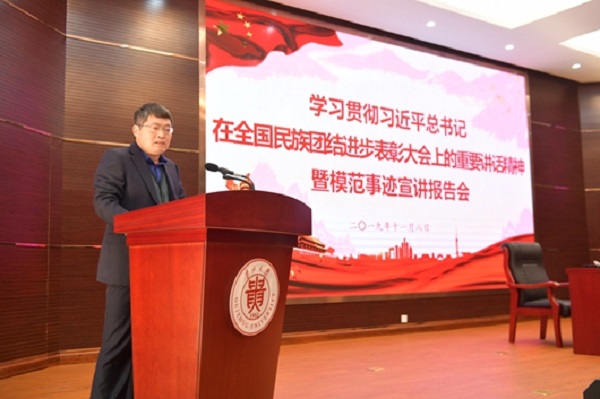 本次报告会由贵州省民宗委联合省直机关工委、省教育厅举办,宣讲报告活动分两期进行,旨在深入推进学习贯彻全国民族团结进步表彰大会精神,大力弘扬贵州模范典型先进事迹,为贵州决战决胜脱贫攻坚凝聚强大的攻坚合力。240余名省直单位党员代表和400余名省属高校师生参加报告会。