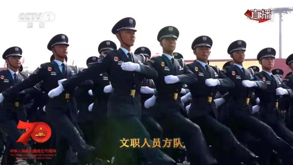 民大新闻网讯 10月1日上午,庆祝中华人民共和国成立70周年大会在北京天安门广场隆重举行,20余万军民以盛大的阅兵式和群众游行欢庆共和国70华诞。作为15个徒步方队之一,文职人员方队首次亮相阅兵盛典。我校计算机科学与工程学院网络工程专业2014届毕业生王照龙,作为文职人员优秀代表阔步走在方队第一排,接受党和人民的检阅。