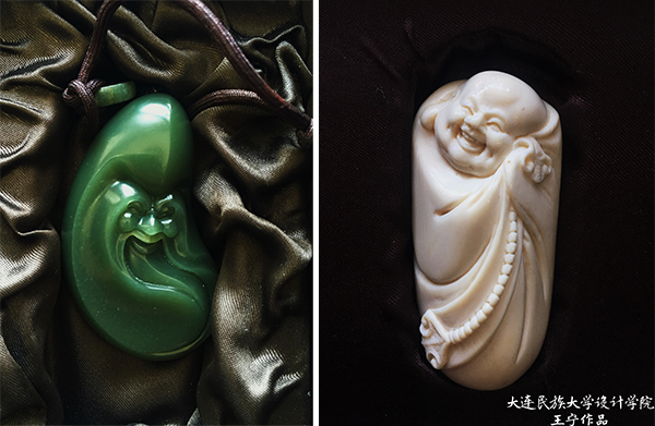 中国玉石雕精品博览会由中国工艺美术协会、扬州市人民政府主办,迄今已举办了13届。本届展会分为玉器展区、漆器展区、全国工艺美术精品展区三大板块,来自北京、上海、广东、河南、辽宁等地的重量级名师大匠汇聚一堂,带来最新的创作精品。王宁的获奖作品《自在如意》采用俄罗斯进口猛犸材料,设计制作历时五个月,人物形态潇洒,雕刻立意新颖别致,内容上传达了中国传统文化中对于人生和谐的外化表达,斩获金奖。另一个获得优秀奖的作品《耄耋之寿》,则采用珍稀的河磨玉料,利用不规则原型,设计出犹如八卦图的造型,一位长髯老人慈眉善目,神采奕奕的形象若隐若现,将人们对长寿之福的美好愿望融入其中,阐述了中华文化对生命的赞颂。