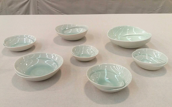 中国陶瓷艺术大展由中国陶瓷工业协会主办,迄今已经四十多年,是中国陶瓷界规模最大、最具影响力的大展活动,被誉为中国陶瓷行业的“奥林匹克”。本次大展分为陶瓷产品设计类、传统艺术陶瓷类、现代陶艺类三大类别,吸引来自全国122所院校、18个单位和省市集体组织的参与。《清波荷韵》属于现代陶艺类,作品取材于夏日盛开的莲花,利用景德镇高白瓷泥做胎,传统拉坯工艺成形,半干时修坯,再用现代陶艺的切割错落重组的技法,把正圆的坯胎做成带有韵律动感的莲花花瓣,线条饱满流畅,最后施以透明青釉,1300度还原烧成,口部积釉少处露出洁白胎体,错落交接处积釉较多犹如翠石。