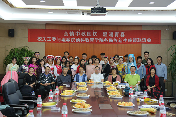 民大新闻网讯 9月27日,学校关工委在金石滩校区与理学院、预科教育学院各族新生代表进行座谈联谊。退休老教授代表李光浩、田森、蒋本国、包耳,相关部门领导和教师以及理学院、预科教育学院各族新生代表参加座谈。座谈会由田森主持。