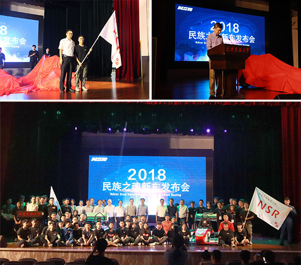 本次发布会共发布了第八代燃油车、第五代电车和第五代节能车三款车型。发布会上,黄永东为三个车队授予车队队旗,并祝福“民族之魂”赛车队能够在2018赛季取得好成绩。机电工程学院院长张汝波致词,介绍了“民族之魂”车队的发展历史,感谢学校党委及各相关部门给予车队的重视与支持,并对本赛季即将奔赴赛场的三支车队寄予厚望。与会师生通过一段视频共同回顾了“民族之魂”赛车队的八年历史,三支车队队长分别介绍了各自赛车和车队的情况。