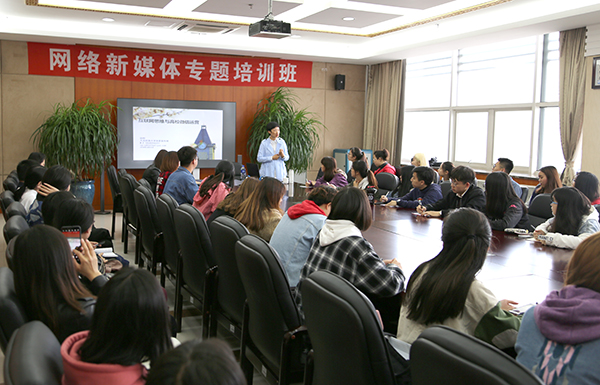 民大新闻网讯 为贯彻落实学校2018年大学生思想政治教育工作计划,进一步加强网络育人工作队伍建设,提高网络思想政治教育水平,促进网络工作队伍能力提升,5月23日,金石滩校区学生工作办公室邀请党委宣传部副部长田野做了“网络新媒体”专题培训,金石滩校区各学院新媒体平台指导教师、学生组织新媒体平台运营学生负责人等50余人参加培训。