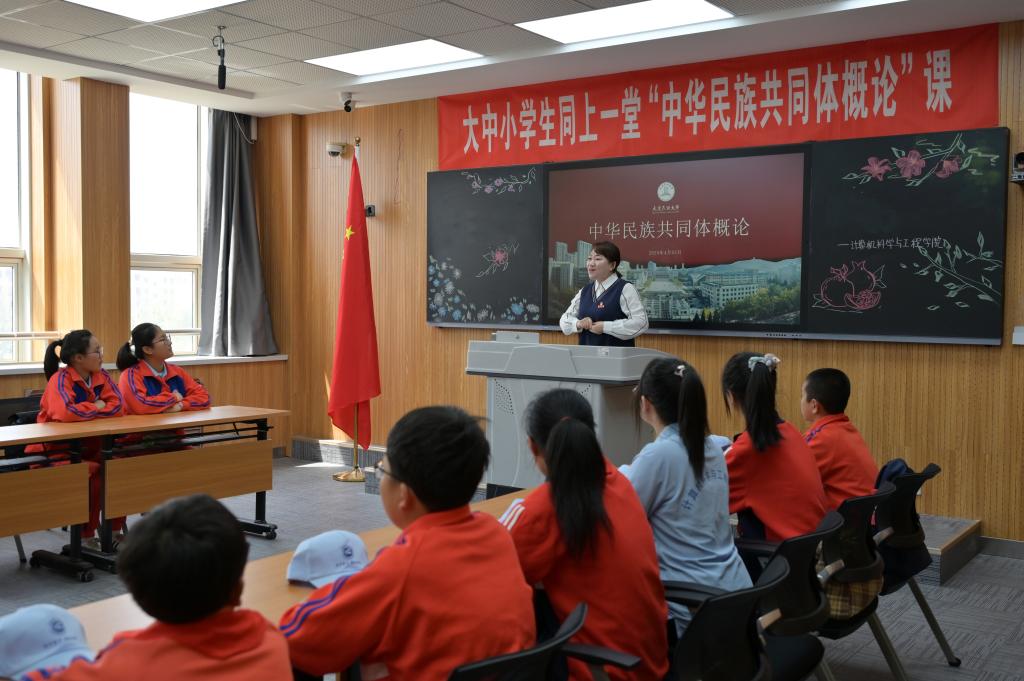 在本次交流研学活动中,计算机科学与工程学院充分发挥思政教育主渠道作用,对提升铸牢中华民族共同体意识融入大中小学思政课教育进行了有益探索。仙人洞镇的中小学校长、大队辅导员、中小学学生和民大学子共上一堂“中华民族共同体概论”课。以创新教学方法,挖掘鲜活元素,为课堂提质增效,在寓教于乐中推动铸牢中华民族共同体意识教育融入大中小学思政课一体化建设进程,首次实现共学、共研的“计算机突破”。