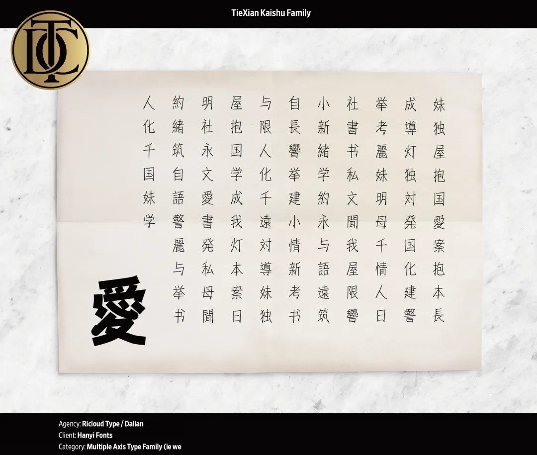 TDC国际字体设计奖作为设计界最具影响力的字体设计奖项之一,在业界享有极高的盛誉。2024年TDC年度奖项由三个不同的竞赛单元组成:传媒设计、字体设计以及字母设计。本届获奖者来自41个国家/地区,字体设计单元共甄选37件作品,其中汉字设计作品有4件。“瑞云袖舞家族”以其灵动飘逸的韵律感,生动展现了中华优秀传统文化与现代审美的完美结合;“铁线楷书家族”则凭借对楷书字形的深度挖掘与再创造,将传统书写与现代图形语言相融合,展现出刚柔并济、极具张力的视觉效果。两组作品赢得了国际评委的一致好评。