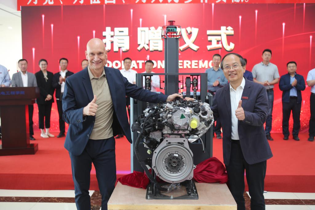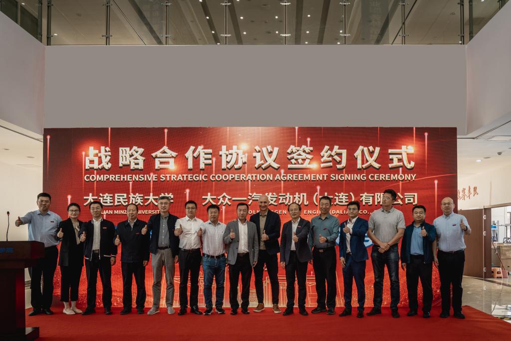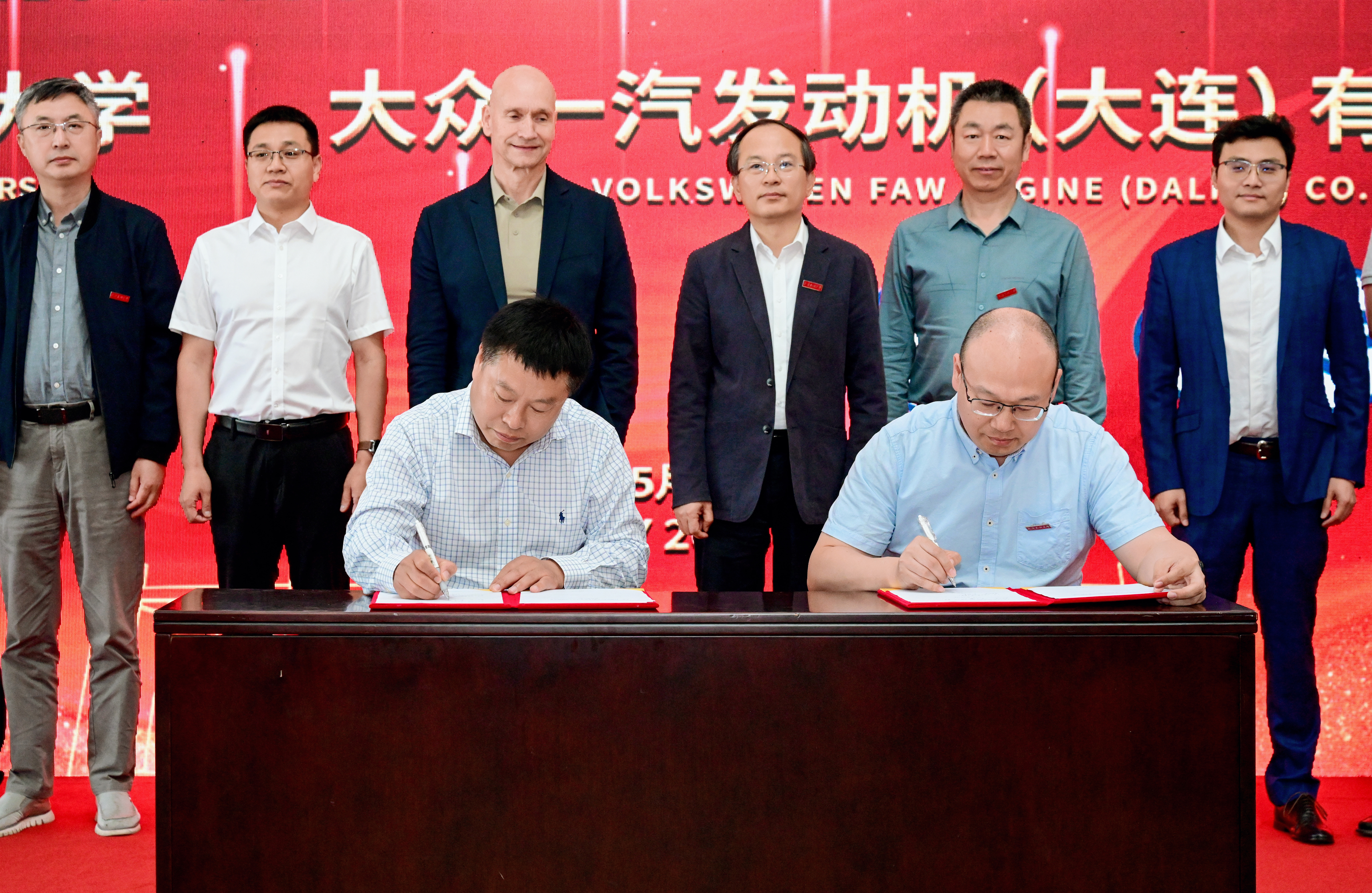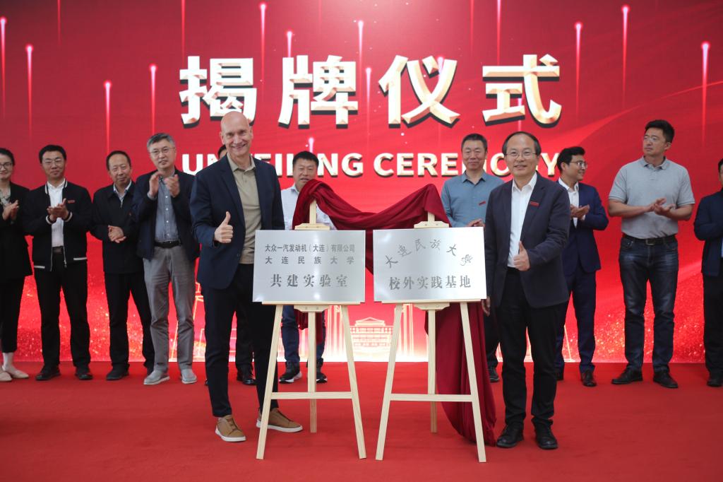 罗莱蒙、冯林为共建实验室和校外实践基地揭牌。大众一汽发动机(大连)有限公司生产技术部总监宋百秋、机电工程学院院长张涛代表校企双方签约。根据协议,大众一汽发动机(大连)有限公司无偿捐赠最新款“大众EA888”发动机一台,支持学校师生教学研究使用。