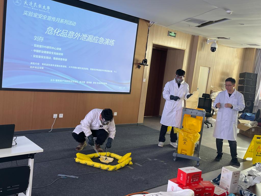 应急演练活动和实验室安全知识讲座分别由生命科学学院、机电工程学院、物理与材料工程学院承办。个人急救演练内容包括意外割伤包扎、意外烫伤处置、海姆立克急救法、CPR心肺复苏术、AED设备使用等;危险化学品泄漏事故应急演练包括有机试剂意外泄露应急演练、火灾初期处置方法及逃生、危险化学药品意外灼伤应急处置、个人防护用品穿戴等内容;实验室安全知识讲座基于国内外实验室的事故案例,以案说患,深入剖析了包括我校在内的国内高校实验室安全管理中存在的问题、规范要求和应对方法。应急演练在两校区共开展3场,各单位相关负责人、实验中心主任、实验教师、实验室负责人、研究生,以及进入实验室开展实验的本科生等600余人次参加活动。