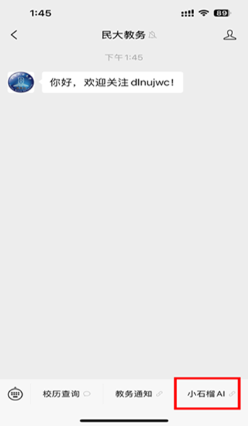师生可关注微信公众号“民大教务”,点击公众号右下角“小石榴AI”,开启与“小石榴”对话,体验人工智能带来的便利。同时,师生在使用过程中可提出宝贵意见和建议,助力持续优化“小石榴”的功能和服务,以便更精准地契合大家需求。