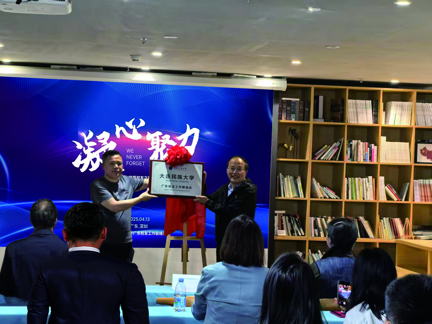 民大新闻网讯 4月13日,大连民族大学广东校友工作联络处成立仪式在深圳市宝安区银田创意园举行。学校党委常委、副校长冯林参加活动并与广东校友工作联络处负责人、设计学院2003级校友孙强共同为联络处揭牌。