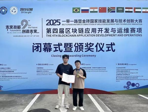 本届大赛由金砖国家工商理事会中方理事会、一带一路暨金砖国家技能发展国际联盟、教育部中外人文交流中心主办,旨在搭建国际技能合作平台,促进技术创新与产教融合。赛事从平台运维、智能合约开发、前后端开发等三个方面系统考察了参赛者区块链技术水平和能力。比赛中,我校学子展现了扎实的专业技能、出色的创新能力和良好的团队协作精神,从来自8个国家的155支代表队中脱颖而出,取得了优异成绩,并晋级将在摩洛哥卡萨布兰卡市举办的2025一带一路暨金砖国家技能发展与技术创新大赛—北非国际赛。