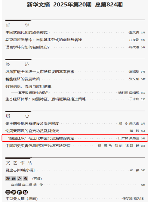 民大新闻网讯 日前,我校中华民族共同体研究院特聘教授田广林作为第一作者在《陕西师范大学学报(哲学社会科学版)》(CSSCI来源期刊)2025年第4期上发表的学术论文《“肇国辽东”与辽代中国北部海疆的奠定》,被《新华文摘》2025年第20期全文转载,被《高等学校文科学术文摘》2025年第10期转载。