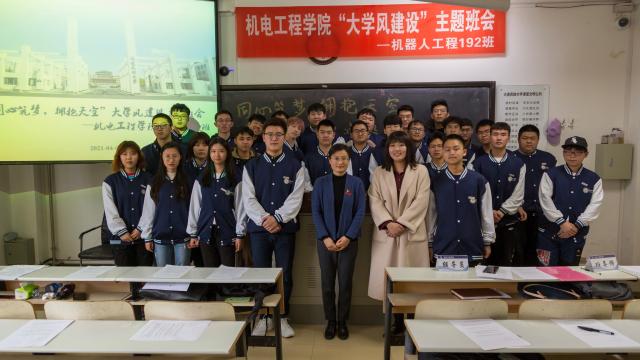 2021年4月初,在大连民族大学第二教学楼114教室,海归博士、教学和科研屡创佳绩的青年副教授、39岁的张江燕老师胸前佩戴校徽,校徽上面端端正正别着鲜亮的党徽。此时的她,正组织机器人工程192班全体学生开展“学党史、塑学风”主题班会活动。