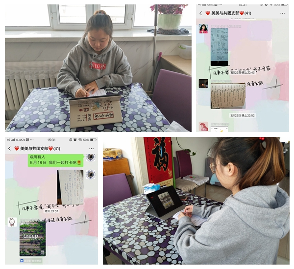 除了高等数学答疑坊外,白彩云还在团支部内部开展了英语百词斩活动。从3月17日开始,每天早上,她都会定时在群里发布学习任务,鼓励大家进行英语的线上自主学习。同学们也十分自觉,晚上10点会准时在群内打卡,晒出自己的笔记、学习资料以及学习的截图,总结自己一天的学习成果。这种线上分享学习成果的独特方式得到了同学们的积极响应和有效反馈,极大地发挥了同学间相互促进的作用。