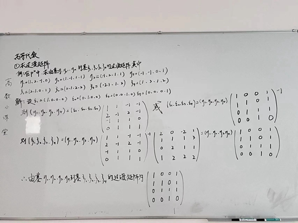 “矩阵是否可对角化要怎么判断呢?”下午有课的刘强老师路过答疑坊的时候看见了李溪萍留下的疑问,提笔写下答案后,他捏着笔想了一会儿,随后找到李溪萍,更加细致地给她讲解了相关知识。