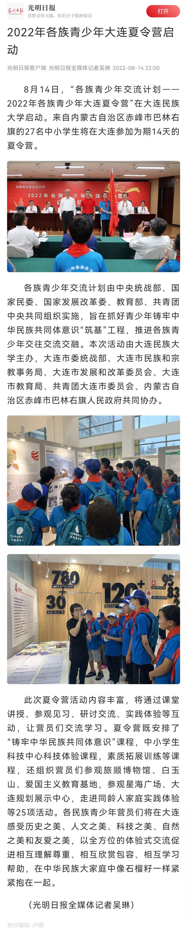 8月14日,“各族青少年交流计划——2022年各族青少年大连夏令营”在大连民族大学启动。来自内蒙古自治区赤峰市巴林右旗的27名中小学生将在大连参加为期14天的夏令营。
