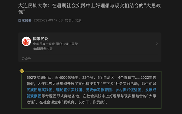 692支实践团队、近4000名师生,22个省、5个自治区、4个直辖市……2022年的暑假,大连民族大学组织开展了文化科技卫生“三下乡”社会实践活动,师生们以民族团结实践团、理论宣讲实践团、党史学习教育团、乡村振兴促进团、发展成就观察团等专题团形式奔赴各地,在社会实践中上好理想与现实相结合的“大思政课”,在社会课堂中“受教育、长才干、作贡献”。