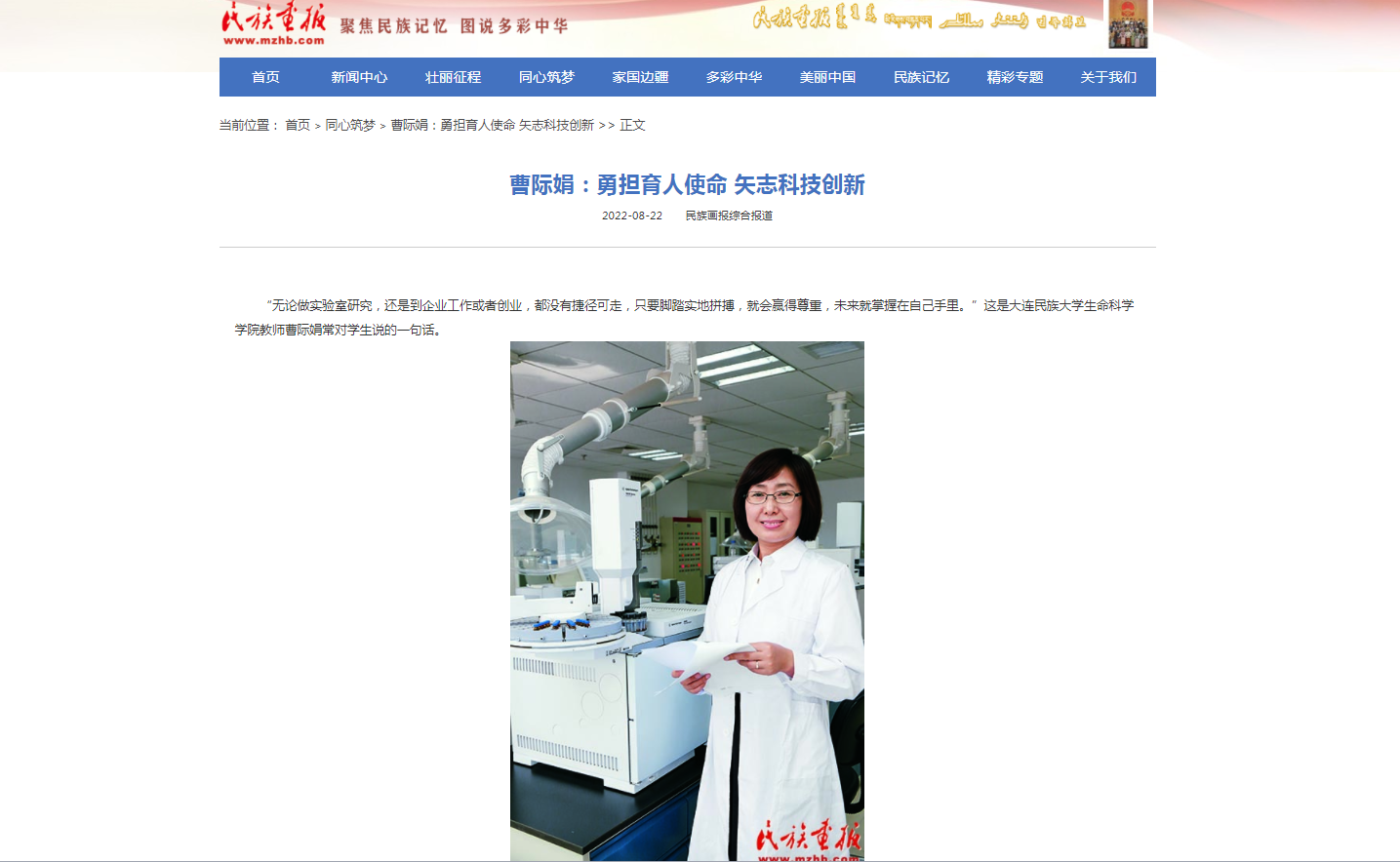 曹际娟,大连民族大学生命科学学院教师,享受国务院政府特殊津贴专家,2009年入选新世纪“百千万人才工程”国家级人选,2012年获得中国青年科技奖,2013年获国家中青年科技创新领军人才,2016年入选国家级项目人才。作为一名从事食品与生物安全检验检疫技术研究的科研工作者,她始终围绕新时代我国科技创新及产业发展需求,扎实做好科学技术的应用研发;作为一名大学教师,她把培养学生作为第一要务,热心教学、精勤育才,努力培养担当民族复兴大任的时代新人。