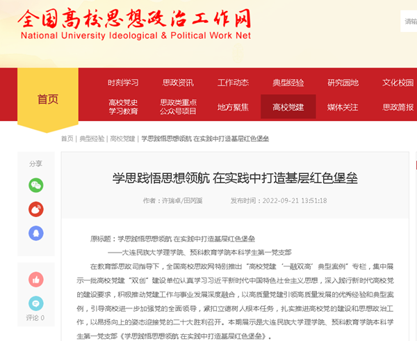 在教育部思政司指导下,全国高校思政网特别推出“高校党建‘一融双高’典型案例”专栏,集中展示一批高校党建“双创”建设单位认真学习习近平新时代中国特色社会主义思想,深入践行新时代高校党的建设要求,积极推动党建工作与事业发展深度融合,以高质量党建引领高质量发展的优秀经验和典型案例,引导高校进一步加强党的全面领导,紧扣立德树人根本任务,扎实推进高校党的建设和思想政治工作,以昂扬向上的姿态迎接党的二十大胜利召开。本期展示是大连民族大学理学院、预科教育学院本科学生第一党支部《学思践悟思想领航 在实践中打造基层红色堡垒》。