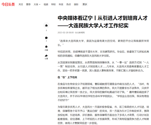 为吸引更多优秀人才,大连民大一方面积极争取省、市、区三级政府对人才引进、培育、保障等各个环节予以“真金白银”的支持,另一方面为引才工作制定抓手,围绕放权松绑、引进培养、评价激励、服务保障等方面出台了多项人才政策、行动计划及配套措施,定位清晰、上下呼应的人才发展政策,形成了具有较强竞争力的人才制度优势,使得人才集聚效应进一步显现。