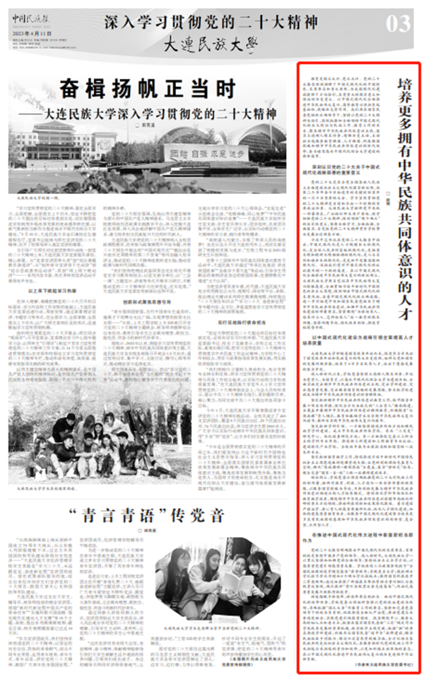 4月11日,《中国民族报》以《培养更多拥有中华民族共同体意识的人才》为题,刊发学校党委书记赵铸署名文章。强调要深刻把握和全面领悟中国式现代化的五大特征与民族工作、教育工作的关系,聚焦铸牢中华民族共同体意识主线,落实立德树人根本任务,增强历史主动,主动担当起服务教育强国、人才强国、科技强国战略和铸牢中华民族共同体意识的时代使命,奋力谱写高水平现代化综合大学建设的崭新篇章。