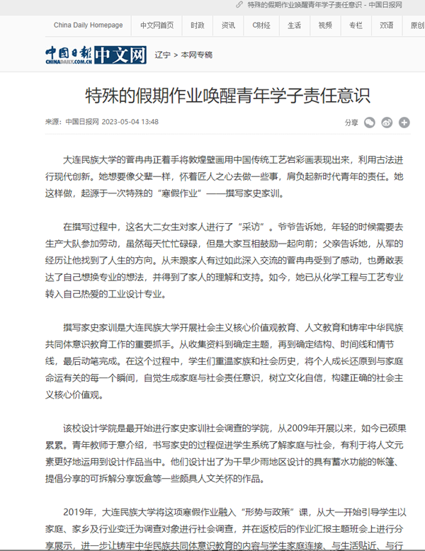 2019年,大连民族大学将这项寒假作业融入“形势与政策”课,从大一开始引导学生以家庭、家乡及行业变迁为调查对象进行社会调查,并在返校后的作业汇报主题班会上进行分享展示,进一步让铸牢中华民族共同体意识教育的内容与学生家庭连接、与生活贴近、与行业接轨,贯穿在学生学习、实践、生活的各个环节。