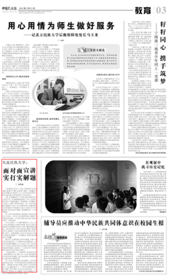 据介绍,大连民族大学利用寒假,开展了学生返乡宣讲党的二十大精神社会实践活动。400余支宣讲团队覆盖了5个自治区、23个自治州、74个自治县,2000余名学生用实际行动铸牢中华民族共同体意识,把党的二十大报告的“书面语”转化为家乡话,送“理论”进家门。