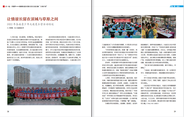 八月的大连,青山碧海、花草摇曳。来自内蒙古自治区赤峰市巴林右旗的各族中小学生走进大连,参加了为期14 天的夏令营活动。同学们走进旅顺博物馆、白玉山爱国主义教育基地 ;参观星海广场、大连规划展示中心;同上一堂铸牢中华民族共同体意识课、科技体验课,完成素质拓展训练 ;在大连民族大学校园里和各族师生一起学习交流,到大连小伙伴的家中做客,参与家庭实践体验……大家深深感受到滨城大连的历史人文之美、城市科技的现代之美,彼此之间也结下了深厚情谊。