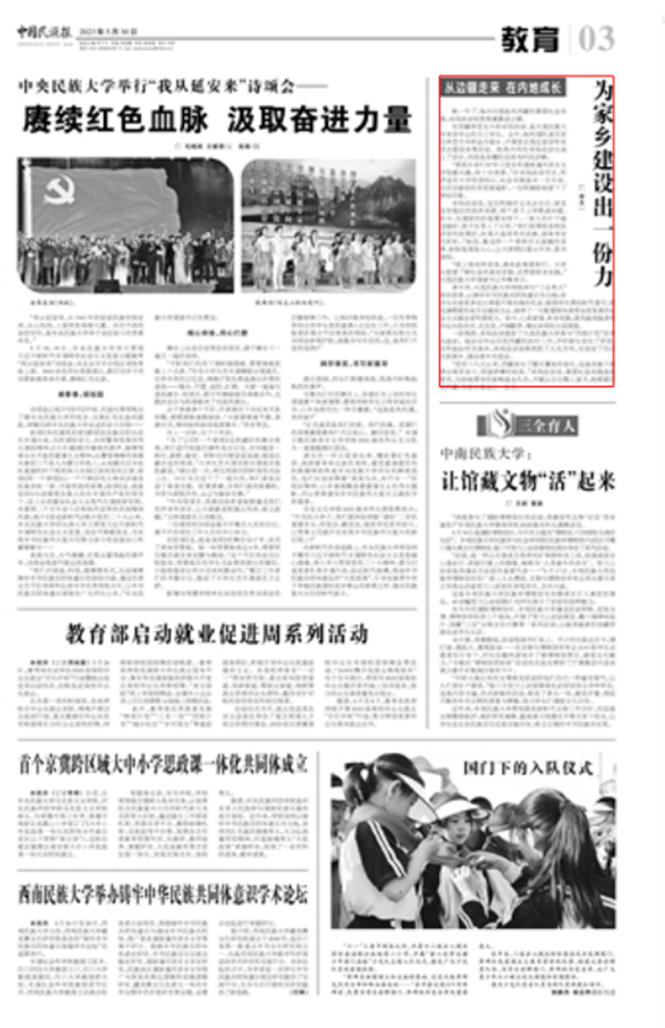 多年来,大连民族大学持续深化“三全育人”综合改革,以铸牢中华民族共同体意识为主线,给学生创造更多走出课堂开展实践的机会,鼓励学生勇担时代重任,到祖国需要的地方去建功立业,培养了一大批德智体美劳全面发展的社会主义建设者和接班人。如今,心系家国、躬身实践,成为越来越多的毕业生经风雨、见世面,开阔眼界、增长本领的生动课堂。