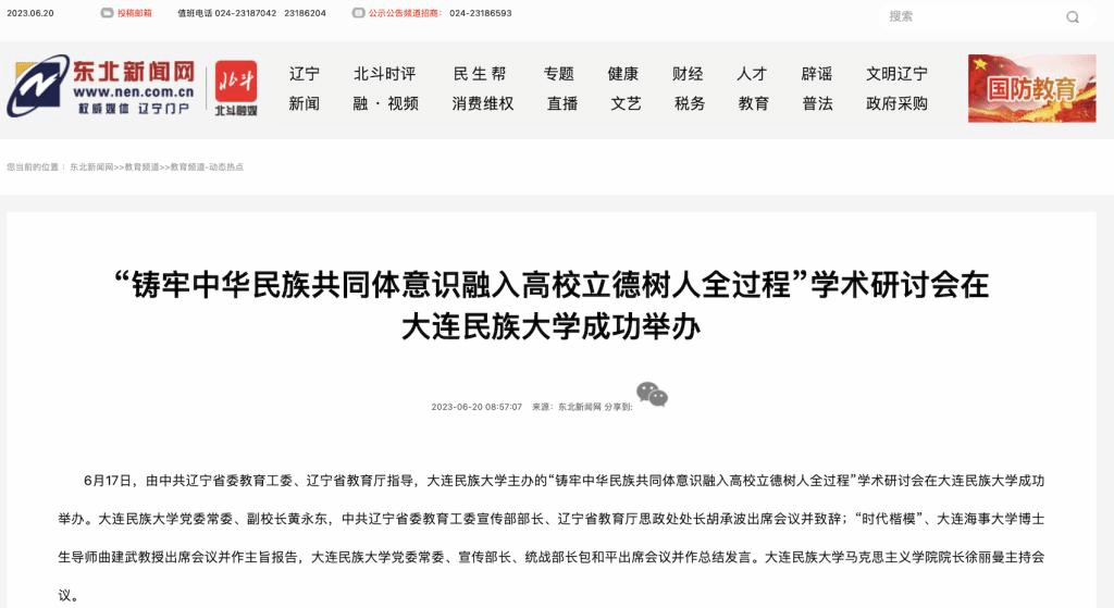 6月17日,由中共辽宁省委教育工委、辽宁省教育厅指导,大连民族大学主办的“铸牢中华民族共同体意识融入高校立德树人全过程”学术研讨会在大连民族大学成功举办。大连民族大学党委常委、副校长黄永东,中共辽宁省委教育工委宣传部部长、辽宁省教育厅思政处处长胡承波出席会议并致辞;“时代楷模”、大连海事大学博士生导师曲建武教授出席会议并作主旨报告,大连民族大学党委常委、宣传部长、统战部长包和平出席会议并作总结发言。大连民族大学马克思主义学院院长徐丽曼主持会议。