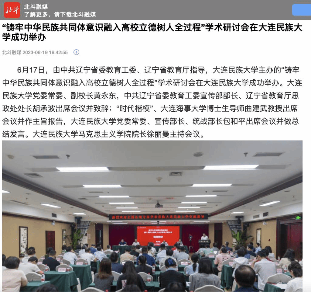 6月17日,由中共辽宁省委教育工委、辽宁省教育厅指导,大连民族大学主办的“铸牢中华民族共同体意识融入高校立德树人全过程”学术研讨会在大连民族大学成功举办。大连民族大学党委常委、副校长黄永东,中共辽宁省委教育工委宣传部部长、辽宁省教育厅思政处处长胡承波出席会议并致辞;“时代楷模”、大连海事大学博士生导师曲建武教授出席会议并作主旨报告,大连民族大学党委常委、宣传部长、统战部长包和平出席会议并做总结发言。大连民族大学马克思主义学院院长徐丽曼主持会议。