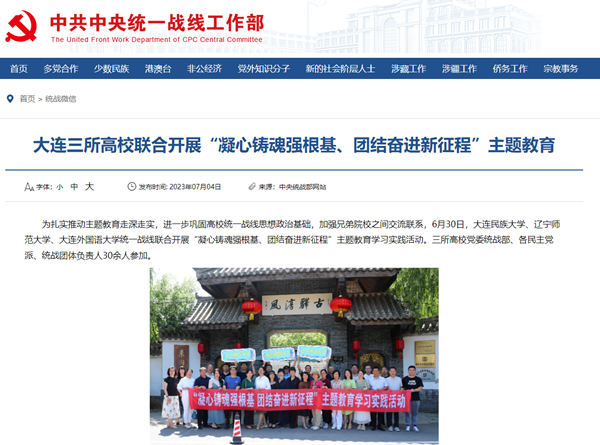 为扎实推动主题教育走深走实,进一步巩固高校统一战线思想政治基础,加强兄弟院校之间交流联系,6月30日,大连民族大学、辽宁师范大学、大连外国语大学统一战线联合开展“凝心铸魂强根基、团结奋进新征程”主题教育学习实践活动。三所高校党委统战部、各民主党派、统战团体负责人30余人参加。