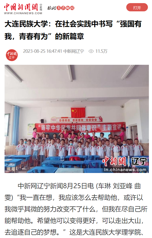 开展一次实地调研、组织一次理论宣讲、讲述一个团结故事、做好一件有益实事,发出响亮民大声音……大连民族大学以铸牢中华民族共同体意识为主线,坚持“育人为先、谋划在前、加强管理、注重实效”,引导学生在暑期社会实践中上好理想与现实相结合的“大思政课”。“千里之行,始于足下”民大学子既是读书人,也是实干者,他们步履不停,收获满满,让青春在中国式现代化的火热实践中绽放绚丽之花,用实际行动书写“强国有我,青春有为”的奋斗新篇章。(完)