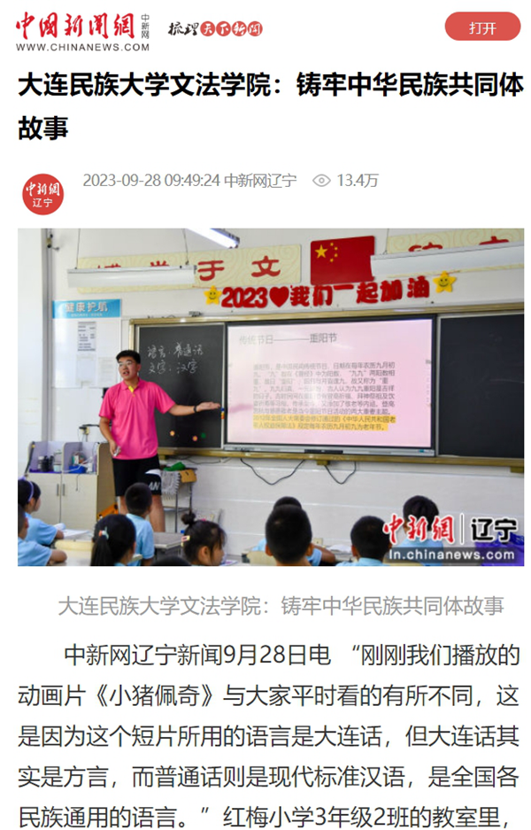 中新网辽宁新闻9月28日电 “刚刚我们播放的动画片《小猪佩奇》与大家平时看的有所不同,这是因为这个短片所用的语言是大连话,但大连话其实是方言,而普通话则是现代标准汉语,是全国各民族通用的语言。”红梅小学3年级2班的教室里,大连民族大学汉教222班张劲松用生动有趣的方式为同学们进行了以“推广普通话 铸牢中华民族共同体意识”为主题的宣讲。
