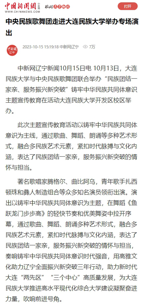 中新网辽宁新闻10月15日电 10月13日,大连民族大学与中央民族歌舞团联合举办“民族团结一家亲、服务振兴新突破”铸牢中华民族共同体意识主题宣传教育在活动大连民族大学开发区校区举办。