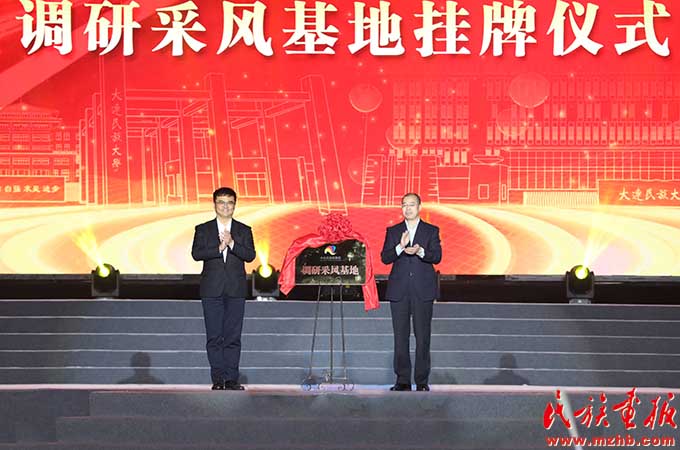 活动现场还举行了中央民族歌舞团与学校调研采风基地挂牌仪式,中央民族歌舞团团长王成刚、大连民族大学校长丁克毅共同为采风基地揭牌。双方将在艺术采风、作品创作、实践培训和人才交流等各方面开展广泛深入合作,为铸牢中华民族共同体意识作出新贡献。