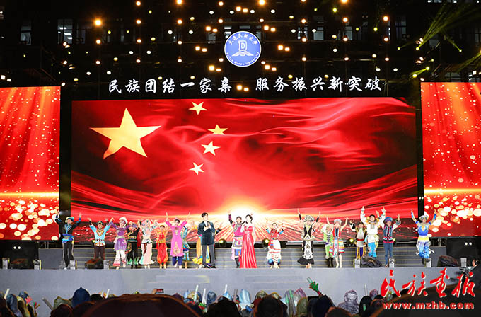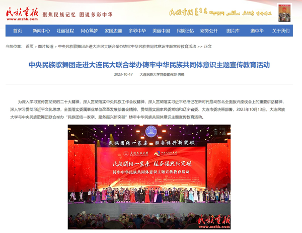 为深入学习宣传贯彻党的二十大精神,深入贯彻落实中央民族工作会议精神,深入贯彻落实习近平总书记在新时代推动东北全面振兴座谈会上的重要讲话精神,深入学习贯彻习近平文化思想,全面落实委属事业单位改革发展部署会精神,贯彻落实国家民委党组和辽宁省委、大连市委决策部署,2023年10月13日,大连民族大学与中央民族歌舞团联合举办“民族团结一家亲、服务振兴新突破”铸牢中华民族共同体意识主题宣传教育活动。