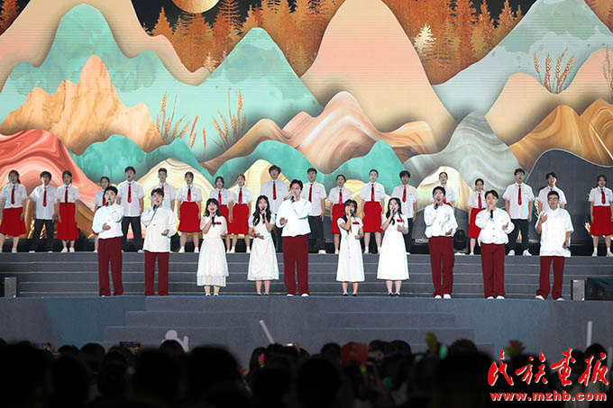 大连民族大学师生带来的朗诵《荣光与梦想》,充分展示了学校建校以来取得的成绩和硕果,展示了广大师生在高水平现代化综合大学建设新征程的精神面貌和奋进士气,体现了全体师生员工在学校党委的坚强领导下,扛起铸牢中华民族共同体意识的重要职责和使命,在助力辽宁全面振兴新突破三年行动,助力新时代大连“两先区”“三个中心”高质量发展中展现民大担当的信心和决心。