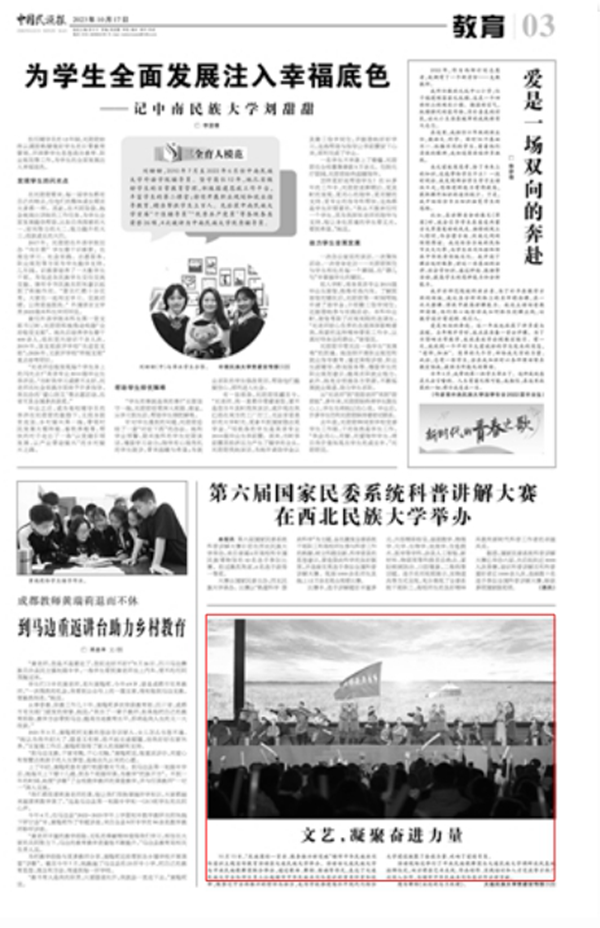 10月13日,“民族团结一家亲、服务振兴新突破”铸牢中华民族共同体意识主题宣传教育活动在大连民族大学举办。活动由大连民族大学与中央民族歌舞团联合举办,通过歌曲、舞蹈、朗诵等形式,表达了大连民族大学全体师生员工扛起铸牢中华民族共同体意识的重要职责和使命,服务辽宁全面振兴的情怀与担当,也为学校推进高水平现代化综合大学建设凝聚了奋进力量、吹响了前进号角。