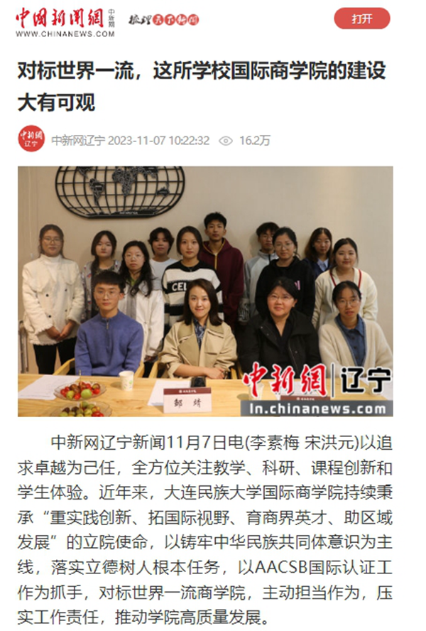 中新网辽宁新闻11月7日电(李素梅 宋洪元)以追求卓越为己任,全方位关注教学、科研、课程创新和学生体验。近年来,大连民族大学国际商学院持续秉承“重实践创新、拓国际视野、育商界英才、助区域发展”的立院使命,以铸牢中华民族共同体意识为主线,落实立德树人根本任务,以AACSB国际认证工作为抓手,对标世界一流商学院,主动担当作为,压实工作责任,推动学院高质量发展。