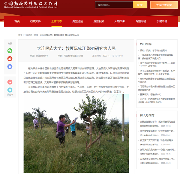 截至目前,阮成江和团队已经去过巴林右旗6次,每次都会进行相关的调研和指导。今年7月,四套“文冠果表型智能感知与分析系统”在巴林右旗万亩文冠果科技创新产业园安装并成功运行,这是数智技术在文冠果产业的应用,真正将实验室的监测系统搬进了田间地头。多年来,阮成江把课堂搬到了田间地头,把论文写在祖国大地,书写了一曲曲感人的民族团结进步之歌。他说:“一代人种植,几代人受益,要完成好国家民委和学校党委所交代的任务,不负重托。”