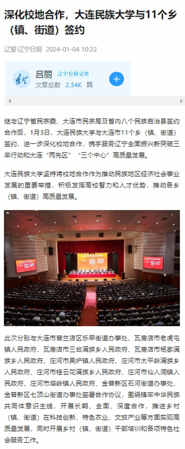 继与辽宁省民宗委、大连市民宗局及省内八个民族自治县签约合作后,1月3日,大连民族大学与大连市11个乡(镇、街道)签约,进一步深化校地合作,携手服务辽宁全面振兴新突破三年行动和大连“两先区”“三个中心”高质量发展。
