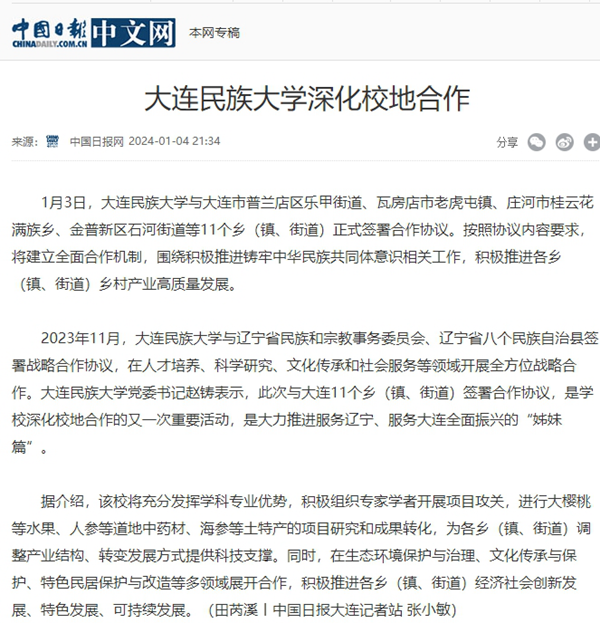 2023年11月,大连民族大学与辽宁省民族和宗教事务委员会、辽宁省八个民族自治县签署战略合作协议,在人才培养、科学研究、文化传承和社会服务等领域开展全方位战略合作。大连民族大学党委书记赵铸表示,此次与大连11个乡(镇、街道)签署合作协议,是学校深化校地合作的又一次重要活动,是大力推进服务辽宁、服务大连全面振兴的“姊妹篇”。