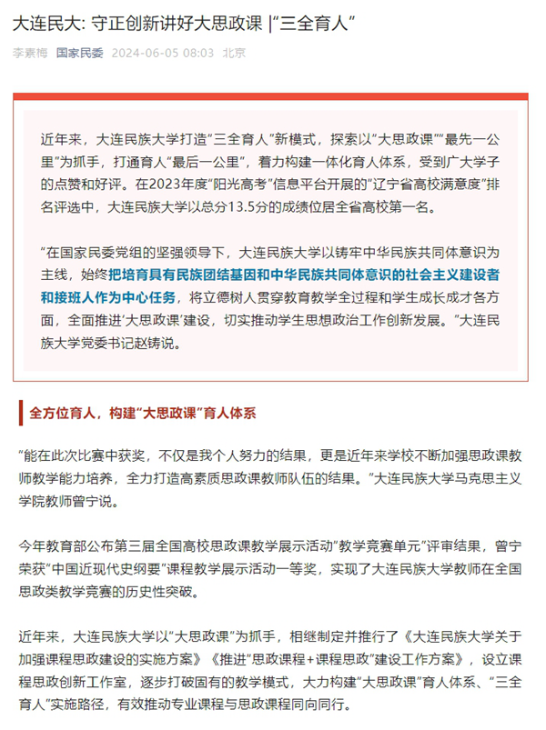 【国家民委】大连民大: 守正创新讲好大思政课 |“三全育人”