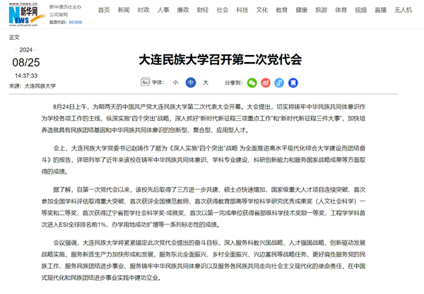 8月24日上午,为期两天的中国共产党大连民族大学第二次代表大会开幕。大会提出,切实将铸牢中华民族共同体意识作为学校各项工作的主线,纵深实施“四个突出”战略,深入抓好“新时代新征程三项重点工作”和“新时代新征程三件大事”,加快培养造就具有民族团结基因和中华民族共同体意识的创新型、复合型、应用型人才。