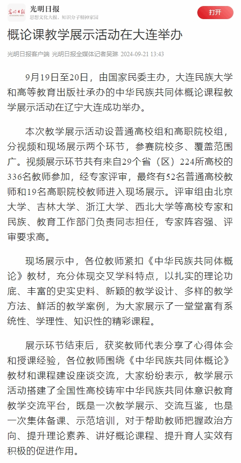 9月19日至20日,由国家民委主办,大连民族大学和高等教育出版社承办的中华民族共同体概论课程教学展示活动在辽宁大连成功举办。