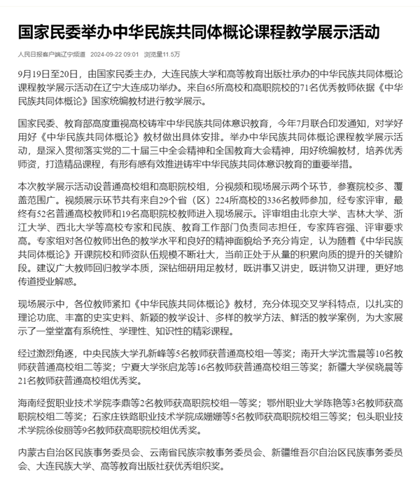 9月19日至20日,由国家民委主办,大连民族大学和高等教育出版社承办的中华民族共同体概论课程教学展示活动在辽宁大连成功举办。来自65所高校和高职院校的71名优秀教师依据《中华民族共同体概论》国家统编教材进行教学展示。