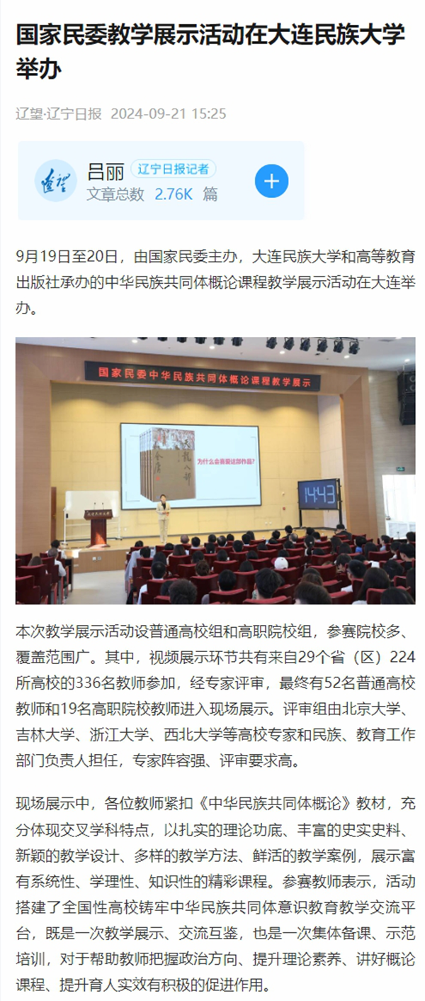 9月19日至20日,由国家民委主办,大连民族大学和高等教育出版社承办的中华民族共同体概论课程教学展示活动在大连举办。
